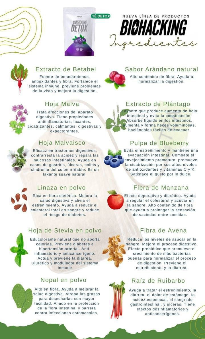 🌱 BIOHACKING DETOX combina ingredientes naturales con propiedades digestivas, depurativas y antioxidantes para ayudarte a sentirte increíble desde adentro.